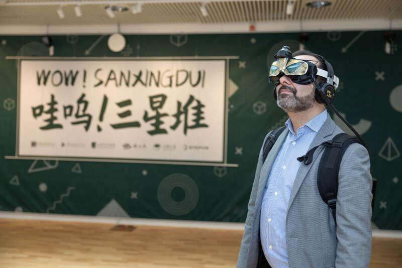 4月27日,参观者在瑞典首都斯德哥尔摩体验《哇呜!三星堆》VR沉浸探索展。参观者可以佩戴VR设备,沉浸式体验以三星堆为代表的古蜀文化。