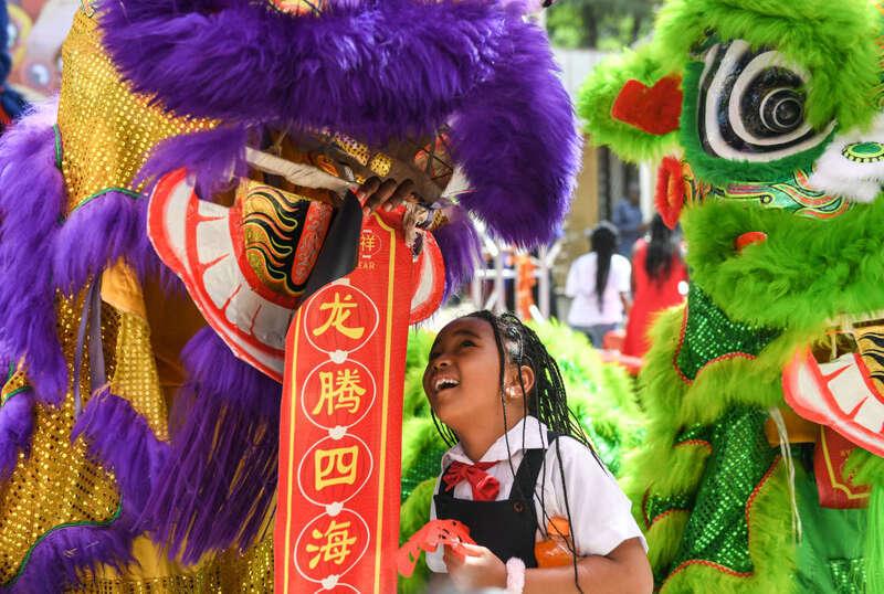 2月7日,小朋友在肯尼亚内罗毕大学孔子学院举行的“龙腾鼓跃闹新春”活动上与舞狮表演队互动。