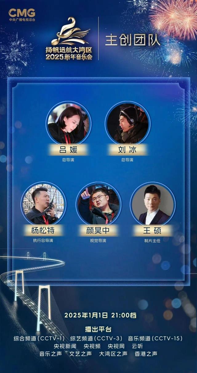 祝福萦绕,乐音飞扬。2025年1月1日21:00档,《扬帆远航大湾区——2025新年音乐会》将在央视综合频道(CCTV-1)、综艺频道(CCTV-3)、音乐频道(CCTV-15),央视新闻、央视频、央视网、云听,以及音乐之声、文艺之声、大湾区之声、香港之声等平台播出,奏响粤港澳大湾区新一年的动人乐章。
