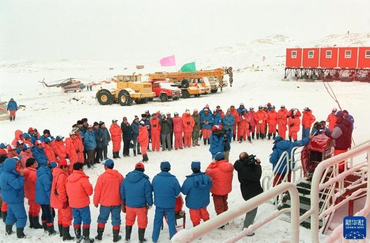 1989年2月26日,中国南极考察队员参加中山站落成典礼。新华社记者 张继民 摄