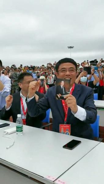 2021年4月29日,毛磊携带曹光彪照片在中国空间站天和核心舱发射现场。