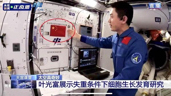 中国空间站天宫课堂开课,五星红旗所在区域就是宁波永新光学股份有限公司制造的中国首台太空显微实验仪。