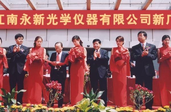 曹光彪(左三)在江南永新光学仪器有限公司成立仪式上剪彩。