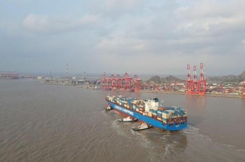 “新上海”轮抵达洋山港,这是自秘鲁钱凯港开港后首个“钱凯—上海”正式航次(2024年12月18日摄,无人机照片)。新华社记者 方喆 摄