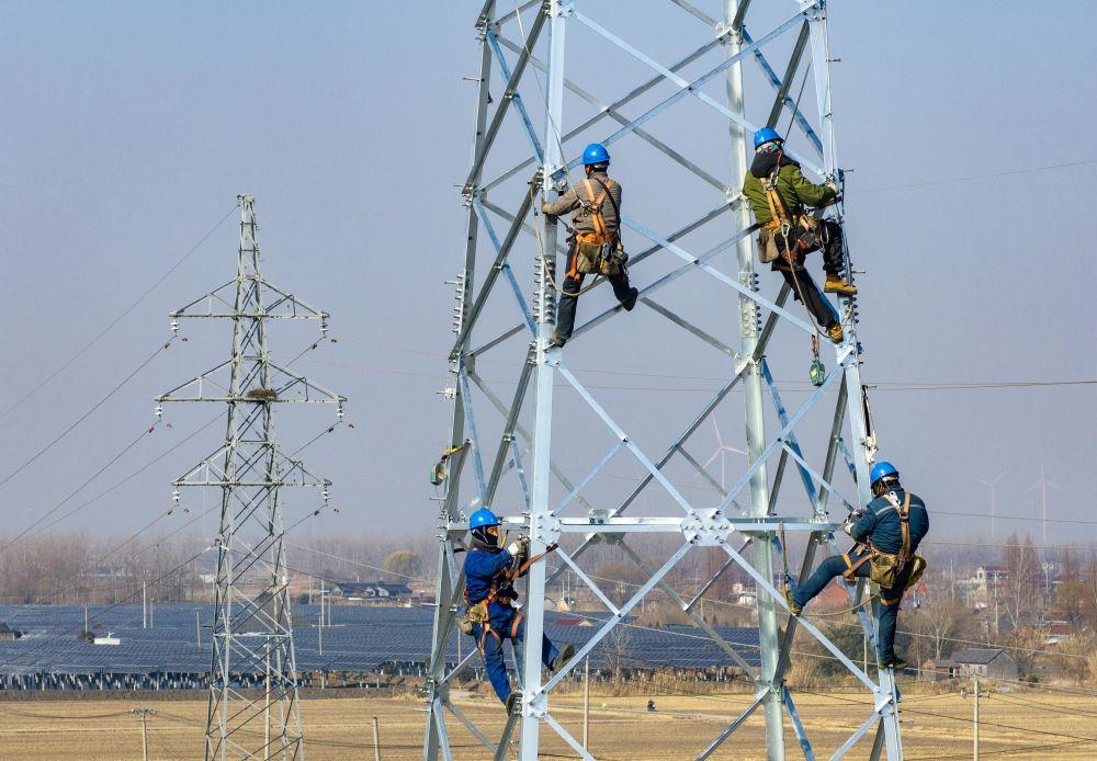 2025年1月1日,施工人员在江苏省泰州市海陵区进行高空组塔作业(无人机照片)。新华社发(汤德宏摄)