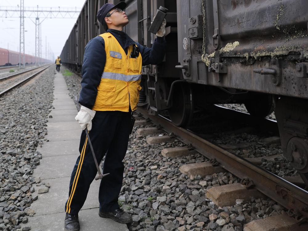 太阳西斜,铁路货车检修基地敲击声依然此起彼伏。检车员范洪川穿行其间,对入库货运列车的车辆走行部和转向架结构进行检查。范洪川说,“希望经我所始发的中国班列跑得又快又稳,搭载更多的货物,跑上更远的地方。”