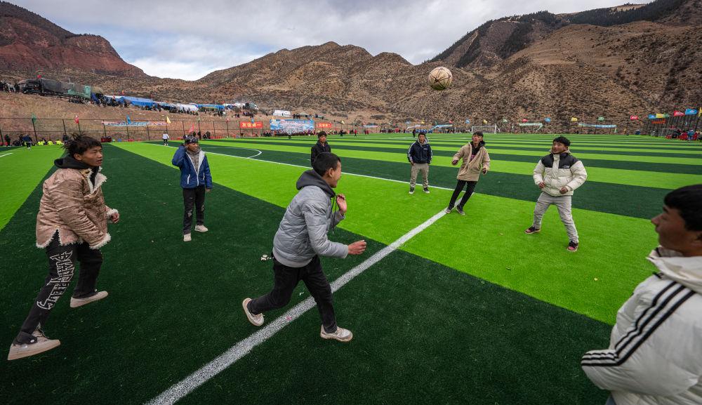 在马利镇“云中球场”,几名球迷趁着球赛间隙踢球玩耍(1月2日摄)。新华社记者 丁增尼达 摄