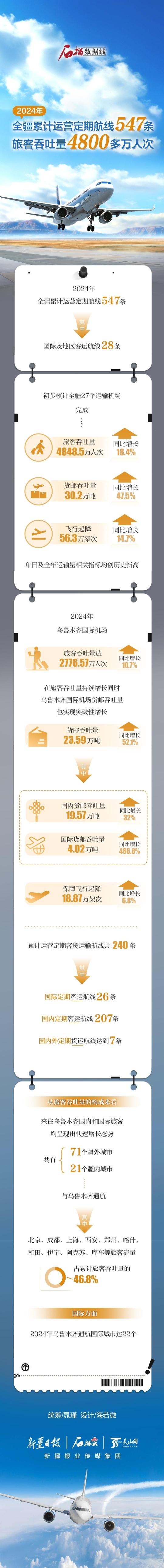 2024年,全疆累计运营定期航线547条,其中国际及地区客运航线28条。初步核计全疆27个运输机场完成旅客吞吐量4848.5万人次、货邮吞吐量30.2万吨、飞行起降56.3万架次,同比分别增长18.4%、47.5%、14.7%,单日及全年运输量相关指标均创历史新高。