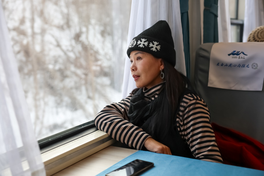 2024年12月26日,一名游客在“雪国专列”Y518次上观赏窗外雪景。受访者供图