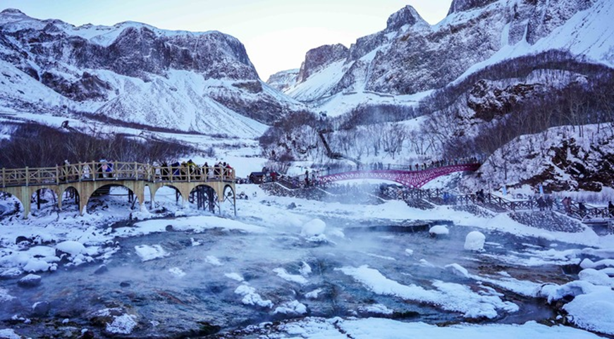 长白山天池向北的延边州,室外温泉的树枝上覆满积雪,泡池内滚烫的地热却不断涌出。伸出脚尖触水,一股暖意向内流淌。在这里安图火山泉、龙井氟温泉、延吉低氘温泉等特色温泉云集,吸引不少海内外游客来体验、度假。