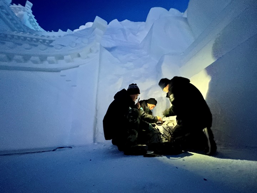 2024年12月24日,工作人员在为即将建成的“云顶天宫”雪雕调试灯光。颜麟蕴 摄