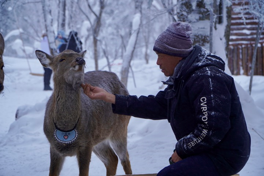 2024年12月26日,老里克湖雪原驿站的工作人员轻抚靠近的狍子。孙逸轩 摄