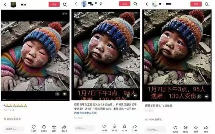 西藏日喀则地震灾情牵动人心,许多网友通过社交平台密切关注救援进展。可与此同时,一些假消息开始疯传。如“一个戴帽子的小孩被重压在倒塌建筑物之下”,这张AI生成的图片被数个账号发布并与灾情关联,还收获了大量转赞评。