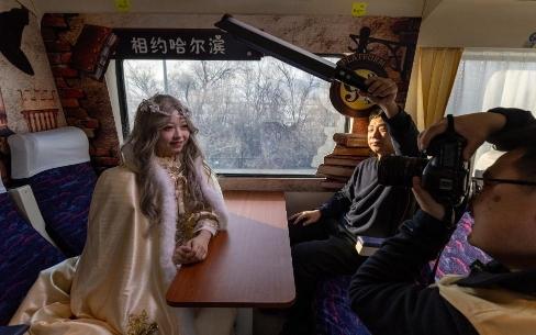 图为2025年1月2日,在哈尔滨开往亚布力南的K5197次列车上,摄影师给乘客拍照。新华社发(张涛摄)