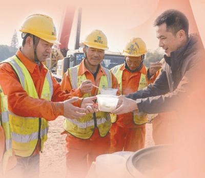 浙江省湖州市长兴县泗安镇东村村干部为高速改扩建项目施工人员送饺子。谭云俸摄