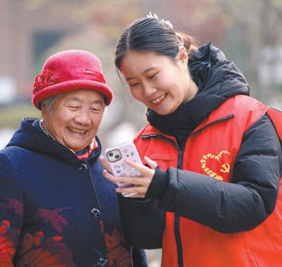 山东省临沂市郯城县郯城街道泉悦社区干部为老年居民介绍智能手机应用的使用方法。张春雷摄