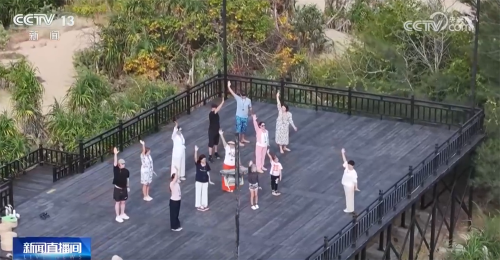 在南山文化旅游区里面的一处海边平台,十多位来自哈萨克斯坦的游客在导游和一位老师的带领下练起了八段锦。游客们在老师的示范下学习了八段锦,完成了拉伸双肩、舒缓头颈的动作。