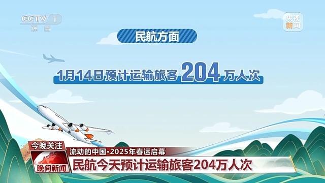 民航方面,14日预计运输旅客204万人次。截至1月13日,2025年春节假期(2025年1月28日至2月4日)国内航线机票预订量超600万张,热门目的地为重庆、成都、北京、哈尔滨、西安等地;出入境航线机票预订量超152万张,比去年春节同期增长约23%。