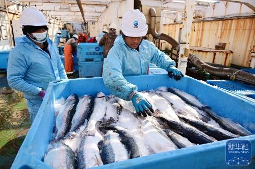 工人在养殖工船上分装三文鱼(1月12日摄)。