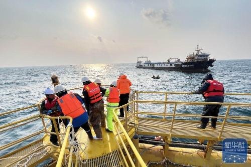 工人在“深蓝2号”上进行拉网作业(1月12日摄)。