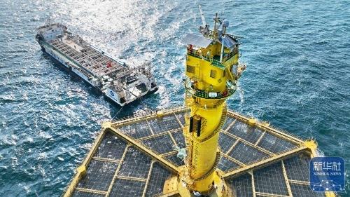 近日,在黄海深处离岸约130海里的青岛国家深远海绿色养殖试验区,中国自主研制的大型深海智能渔业养殖装备“深蓝2号”迎来首次三文鱼收鱼作业。据介绍,该网箱共养殖三文鱼近40万尾,存活率高,长势良好。新华社记者 李紫恒 摄