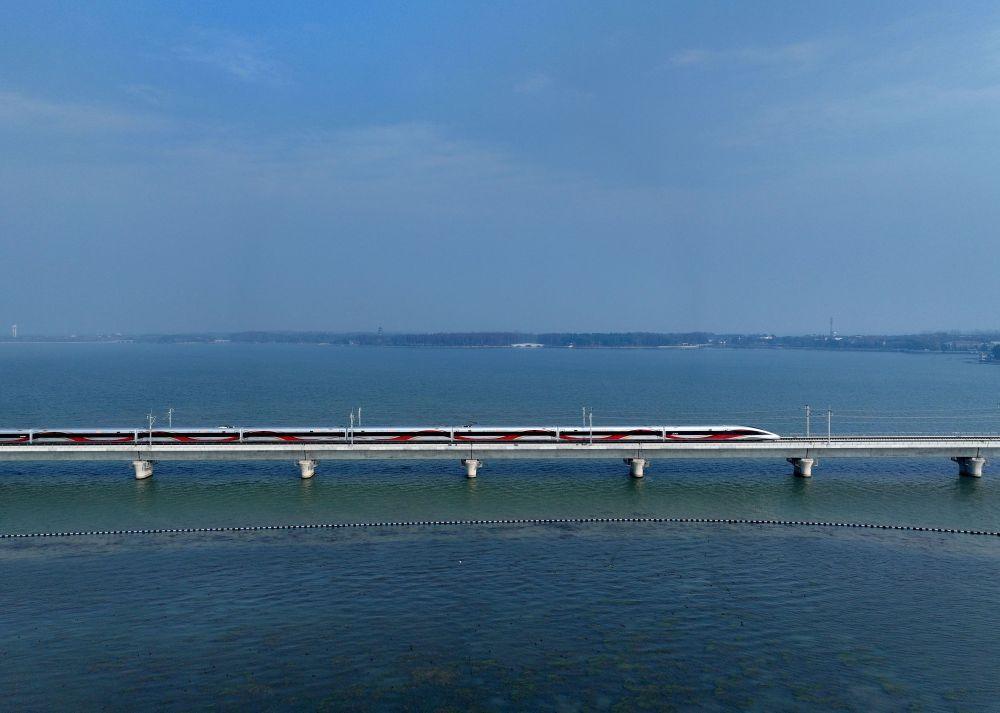 列车驶过沪苏湖高铁元荡湖段(无人机照片)。 新华社记者 邢广利 摄