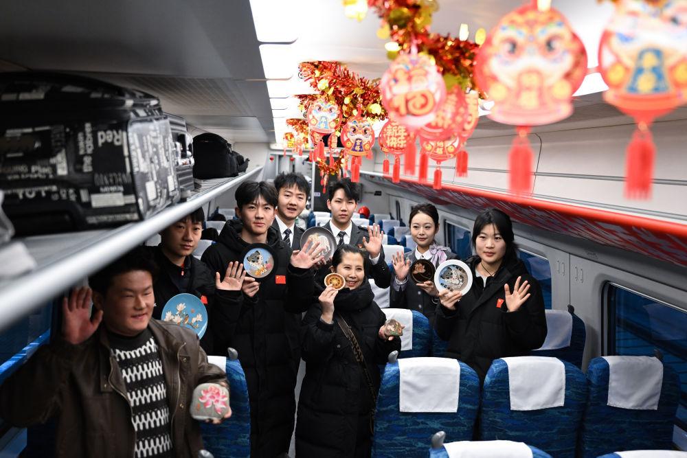 中国铁路西安局集团有限公司西安客运段等铁路单位联合开展“金蛇迎春文化送祝福 高铁先锋温暖回家路”活动。在由西安北开至香港西九龙的G828次列车上,列车工作人员用中国结、福字、春联等装饰品,为车厢营造出浓厚春节氛围。