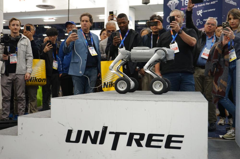 1月8日,在美国拉斯维加斯,人们在中国企业宇树科技的展区观看机器狗展示。新华社发(曾慧摄)