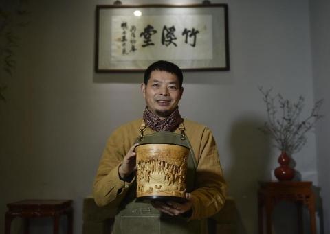 1月7日,在位于安徽省黄山市徽州区的徽州雕刻博物馆,洪建华展示自己创作的竹雕作品。新华社记者 张端 摄