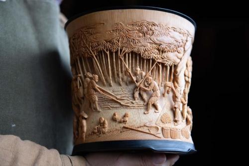 黄山市徽州区手艺人洪建华是徽州竹雕项目的代表性传承人,从事徽州竹木雕刻创作已有30余年。初中毕业后,洪建华怀揣着对雕刻艺术的热爱,从一名普通的木匠做起,学习一些基础的雕刻技艺。他将文物鉴赏大家王世襄编写的《竹刻》一书视为珍宝,时刻捧读、钻研、实践,逐渐掌握了竹雕的浮雕、圆雕、线刻等几十种雕刻技法。2006年,洪建华的竹雕笔筒作品《竹林七贤》被故宫博物院收藏。