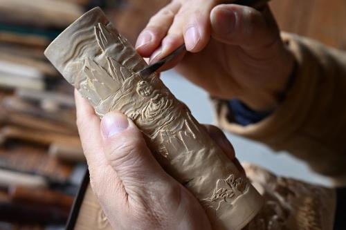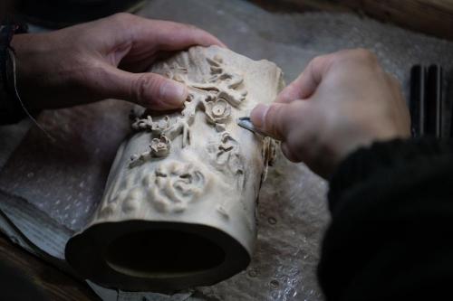 1月7日,在位于安徽省黄山市徽州区的徽州雕刻博物馆,洪建华的徒弟在进行竹雕创作。新华社记者 张端 摄