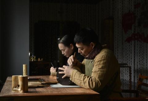 1月7日,在位于安徽省黄山市徽州区的徽州雕刻博物馆,洪建华(前)和妻子张红云在进行竹雕创作。画面右方为洪建华创作的作品。新华社记者 张端 摄