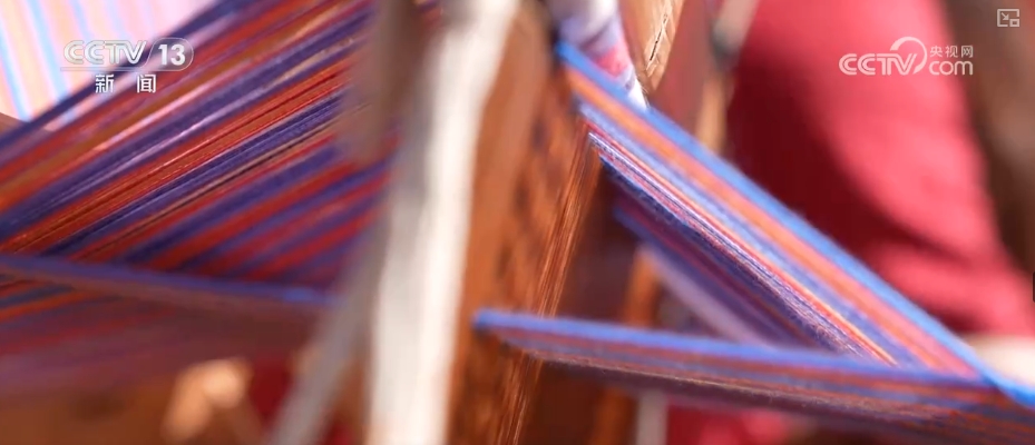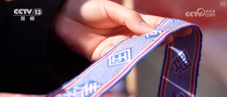 而织带就是绑在额头上用于扎头帕的一条丝带。外观上看好像平平无奇,但仔细观察可以发现,这里边藏有“国泰民安”“国富民强”“吉星高照”等字样。织带工艺复杂,上面的图案和文字都是由一根根线从下往上织成。