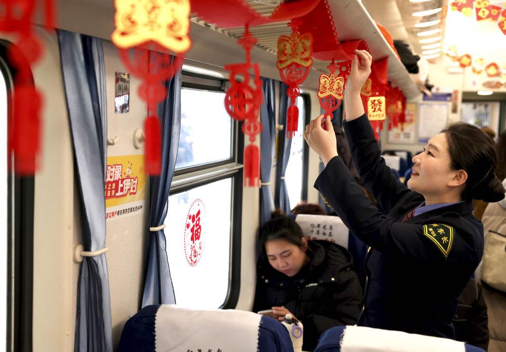 1月14日,列车工作人员在装饰车厢。新华社发(王旺旺 摄)