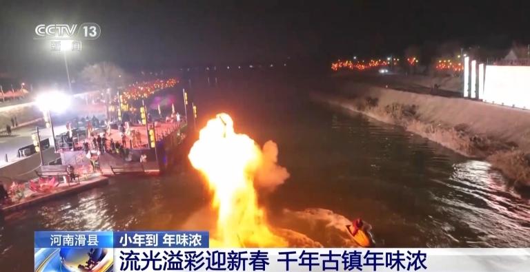 为迎接新春,古镇除了夜景灯光布置外,还有丰富的民俗表演,特别是水上火壶表演让人惊叹,表演者们身穿专业的防护服,手持火壶,从水面上腾空而起,火壶在空中划出一道道绚丽的轨迹,舞动时如同凤凰展翅,让游客沉浸在传统文化的魅力中。