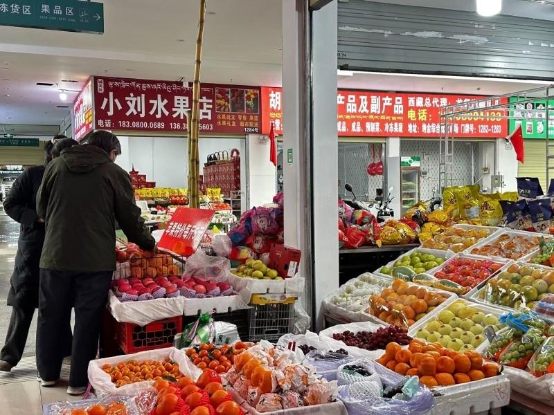 在拉萨市中心的一家超市内,新鲜蔬果采购区各类新鲜蔬菜、水果整齐摆放在货架上,顾客正在仔细挑选菜品和比对价格。“我家住这附近,这里蔬菜水果种类丰富,每次来都能挑选到新鲜又合心意的,价格也很实惠。”拉萨市民尼玛说。