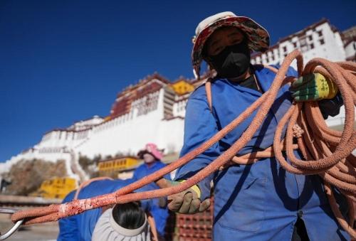 冬日的阳光,温暖照耀古城拉萨,布达拉宫金顶熠熠生辉。一年一度的外墙粉刷工作落下帷幕,局部细节收尾工作紧随其后有序展开。