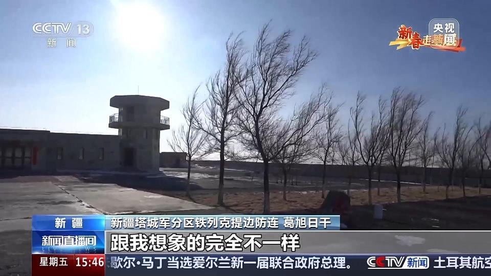 新疆塔城军分区铁列克提边防连 张飞:像今天这种天气的话,可能在冬季两三个月的时间,可能有这么一两天,这种天气是非常难得的。你像你看到的这种比较大的树,它最少有15年的树龄了,我们一茬茬官兵经过不懈的努力才把这些树种成这样子,一场大风可能就把刚种下去的树就连根拔起了,前几天在一场大风的时候就把旗杆给吹倒了,就在那个地方放着。