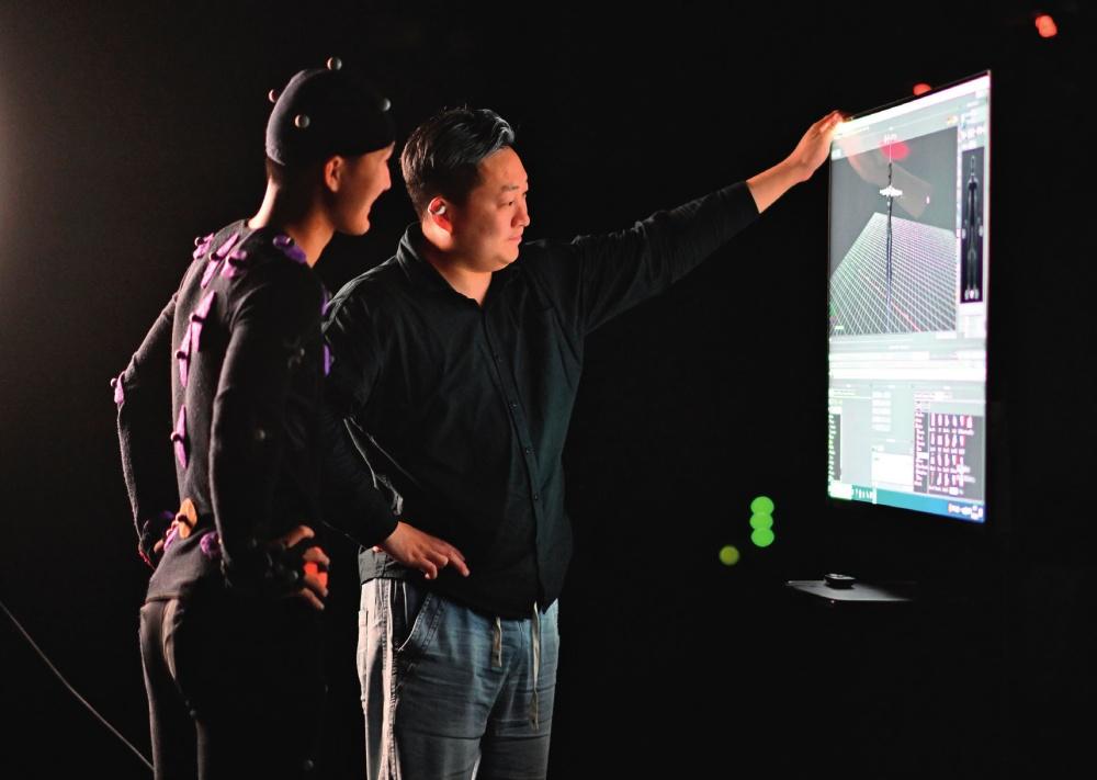 崔盛辑(右)和同事马鑫琪在 动作捕捉棚内查看电脑生成的虚拟 角色动作(2024年4月23日摄) 赵子硕摄