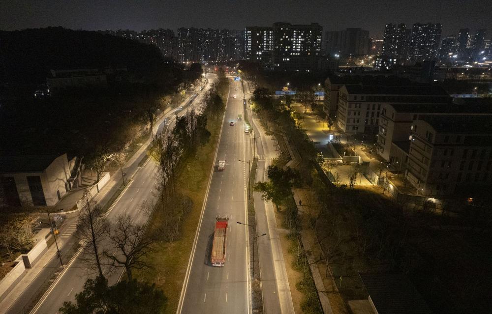 1月13日晚,孔令建夫妇驾驶大货车行驶在杭州市拱墅区的路上,提前前往第二天要装货的地点(无人机照片)。新华社记者 才扬 摄