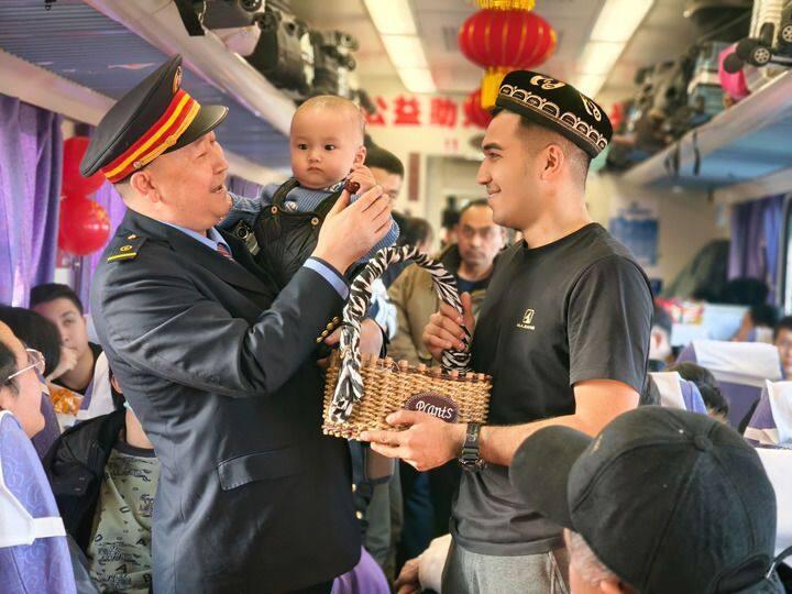 “列车巴扎开市啦!”1月25日早9点,祖国大西北,7558次“和田玉龙号”列车开出新疆和田站。没多久,12号车厢里就传来列车长坡拉提汗的吆喝声。车厢里立马热闹起来,售卖农副产品的吆喝声、旅客的笑声和交谈声奏响了欢乐的旋律……