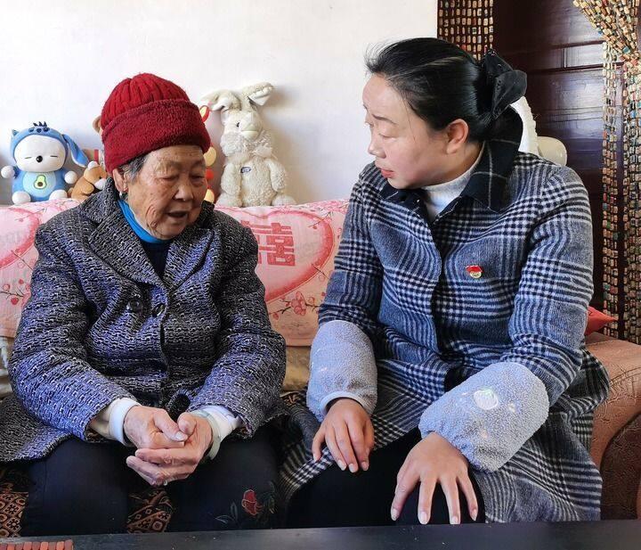 杨汝钰(右)在社区一位老人家中进行入户慰问。新华社发(李建华摄)