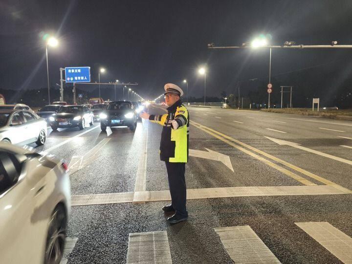 1月25日晚,张洁在乐山市苏稽新区西岸路口指挥疏导交通。新华社发(刘冉摄)