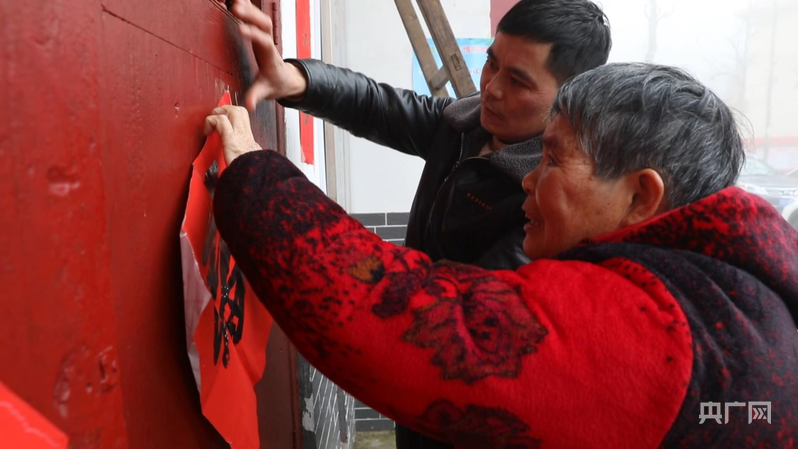 彭德良与70多岁母亲贴春联(央广网记者 郇康新 摄)