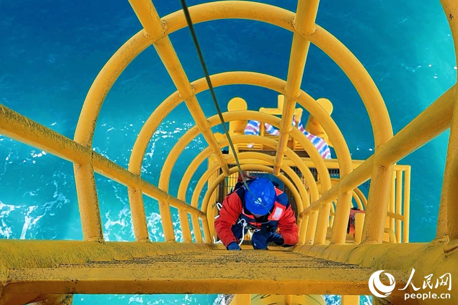 吉荣斌系好安全绳,沿着阶梯逐级爬上平台。人民网 李唯一摄