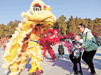 河南南阳卧龙岗文化园内,市民在欣赏舞狮表演。高嵩 摄(新华社发)