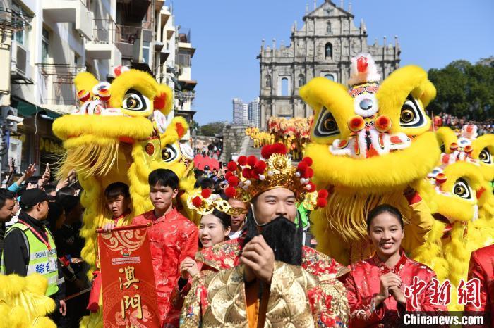 1月29日,澳门特区政府旅游局在大三巴牌坊前举行“欢乐春节——2025年龙腾舞跃贺新春”社区巡演活动,与市民、游客欢度新春。图为工作人员装扮成“财神”,与醒狮一起向围观的市民、游客送祝福。中新社记者 郑嘉伟 摄