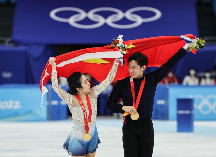 2022年2月19日,中国选手隋文静(左)/韩聪在奖牌颁发仪式后。当日,北京2022年冬奥会花样滑冰双人滑自由滑比赛在首都体育馆举行,中国选手隋文静/韩聪夺得双人滑冠军。新华社记者 曹灿 摄