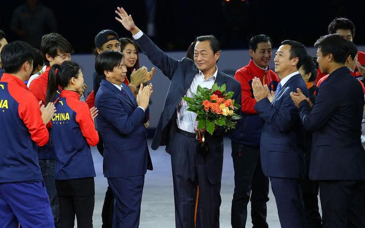 资料图:中国花样滑冰队总教练姚滨(中)在颁奖仪式上向观众挥手致意。当日,2015奥迪中国杯花滑大奖赛在北京首都体育馆落幕。在比赛后,姚滨获颁终身成就奖。新华社记者 曹灿 摄