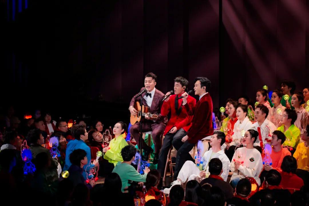 节目开场,三位男歌手坐在穿过观众席、通向主舞台的“如意柄”一端,营造不插电演唱会的感受,身边亲密簇拥的人群,正符合粤语金曲与观众零距离的特质。
